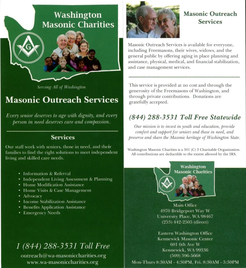 Washington Masonic Charities is the business-based public charity incorporating and overseeing all of the charitable activities of the Grand Lodge of Washington. We provide charitable support to the Masons, their families and the general public throughout the state of Washington by means of the Masonic network of lodges (182) and individual Masons (approximately 14,000). These charitable activities include scholarships, Library & Museum educational materials and artifacts; provide a range of services through multiple programs to seniors across the state through outreach; children's programs and general charitable gifts.